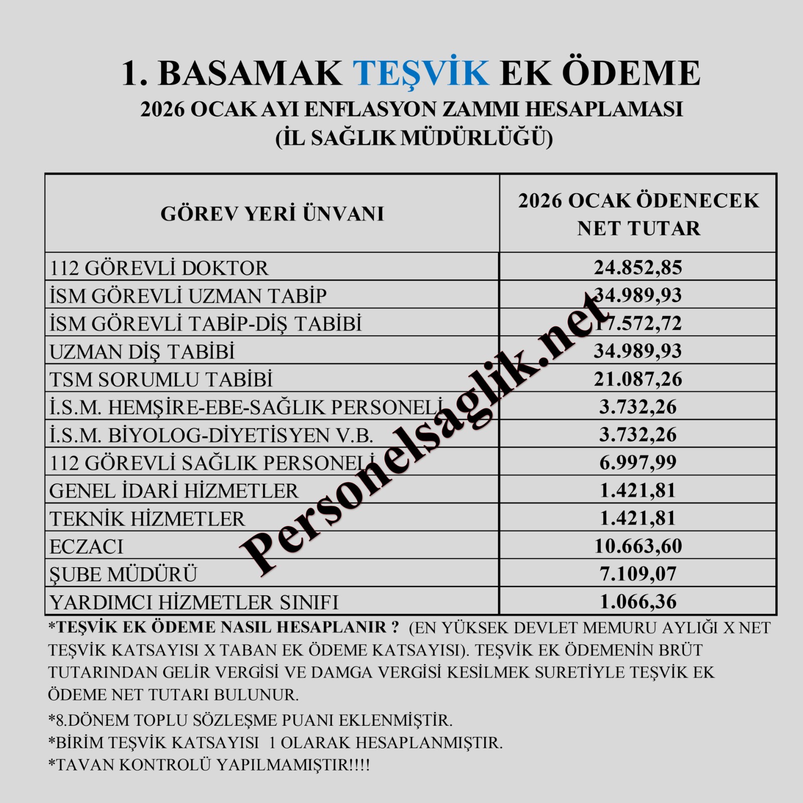 Ocak 2026 memur zammı sonrası oluşan sağlık personeli teşvik ücretlerine dair tablo şu şekilde: