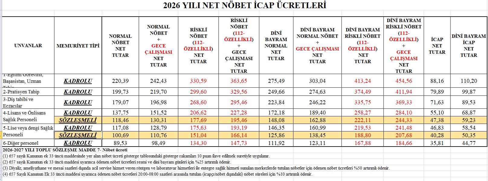 2026 yılı memur zammı sonrası güncel sağlık personeli nöbet ücretleri, unvan ve hizmet sınıflarına göre aşağıdaki tabloda yer almaktadır.