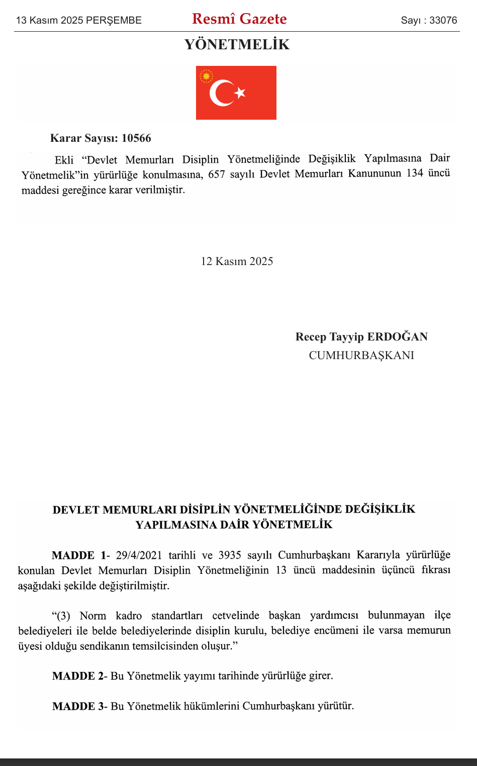 Devlet Memurları Disiplin Yönetmeliğinde Değişiklik Yapılmasına Dair Yönetmelik (Karar Sayısı: 10566) Resmi Gazete de yayımlandı.