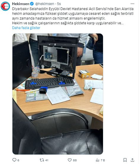 Hekimsen’in açıklamasında, şu ifadelere yer verildi: “Diyarbakır Selahaddin Eyyübi Devlet Hastanesi Acil Servisi’nde Sarı Alan’da hekim arkadaşımıza fiziksel şiddet uygulamaya cesaret eden sağlık teröristi aynı zamanda hastaların da hizmet almasını engellemiştir. Hekim ve sağlık çalışanlarının sağlıkta şiddete karşı uygulanabilir ve caydırıcı cezalara bir türlü imza atamayan Sn.@drfahrettinkoca’ya, ‘Hasta Memnuniyeti’ odaklı bir çözüm öneriyoruz.”