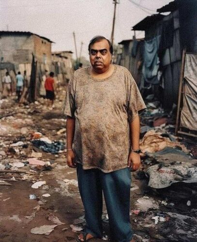 Dünyanın en zenginleri arasında yer alan Hint milyarder Ambani her zamanki takım elbisesi yerine eski, yıkanmamış gibi görünen büyük beden tişörtü ve mavi pantolonuyla bir çöplüğün yanında resmedildi.