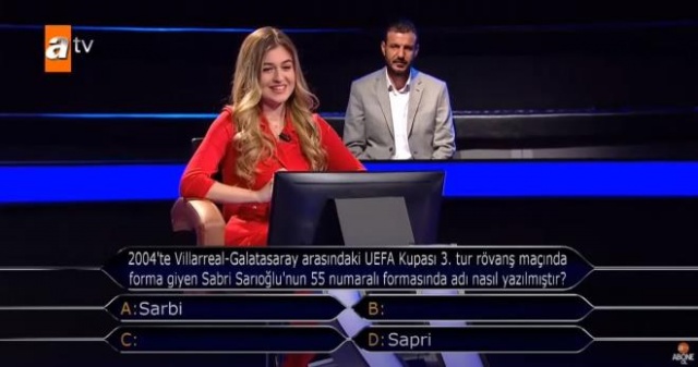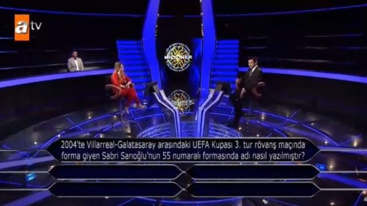 "Kim Milyoner Olmak İster" yarışmasının 18 Mayıs'ta yayınlanan programında, 30 bin TL'lik "2004'te Villarreal - Galatasaray arasındaki UEFA Kupası 3. tur rövanş maçında forma giyen Sabri Sarıoğlu'nun 55 numaralı formasında adı nasıl yazılmıştır?" şeklinde bir soru geldi.