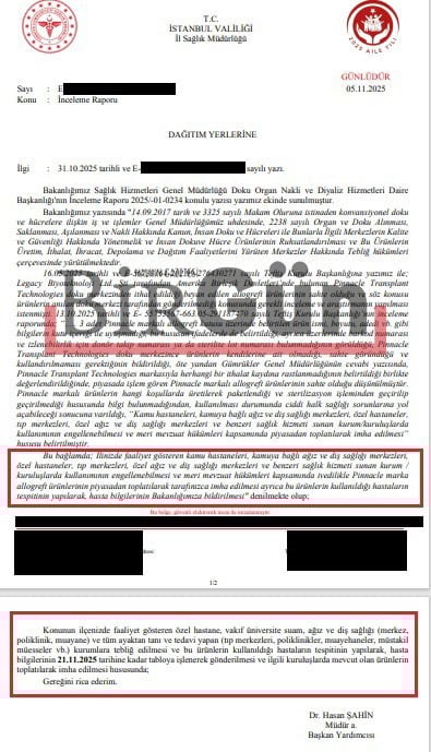 İl Sağlık Müdürlüğü'nün yazısında, 'Pinnacle markalı ürünün kutusu üzerinde belirtilen ürün ismi, boyutu, adedi vb. gibi bilgilerin kutu içeriği ile uyuşmadığı, ayrıca üzerlerinde barkod numarası ve izlenebilirlik için donör takip numarası ya da sterilite lot numarası bulunmadığının görüldüğü, ABD'deki doku merkezince ürünlerin kendilerine ait olmadığı, sahte göründüğü ve kullandırılmaması gerektiğinin bildirildiği' vurgulandı.