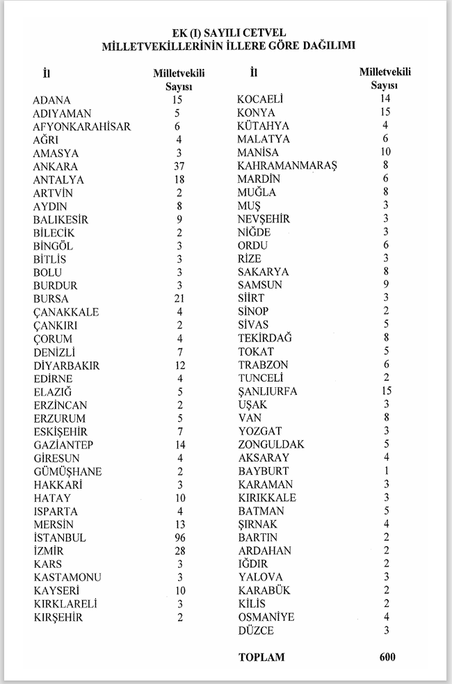 YSK, illerin çıkaracağı milletvekili sayılarını ve seçim çevrelerini güncelledi. Karar Resmi Gazete'de yayımlandı. Karara göre, toplam 600 milletvekilinden her il için 1 milletvekili garantisi verildi. Kalan milletvekillikleri ise nüfusa göre iller arasında dağıtıldı. Çok sayıda milletvekili çıkaran illerde birden fazla seçim çevresi oluşturuldu.