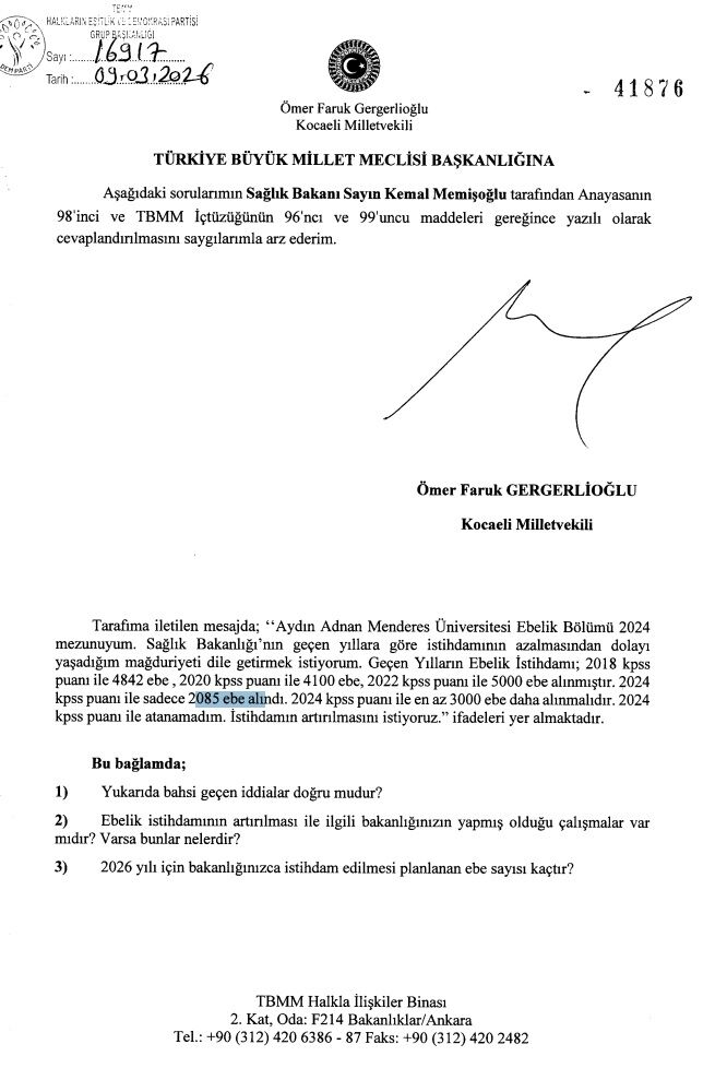 Kocaeli Milletvekili Ömer Faruk Gergerlioğlu, ebe istihdamına ilişkin sorunları Türkiye Büyük Millet Meclisi gündemine taşıdı. Sağlık Bakanı Kemal Memişoğlu’nun yanıtlaması istemiyle verilen soru önergesinde, özellikle son yıllarda artan mezun sayısına rağmen atamaların yetersiz kaldığına dikkat çekildi.