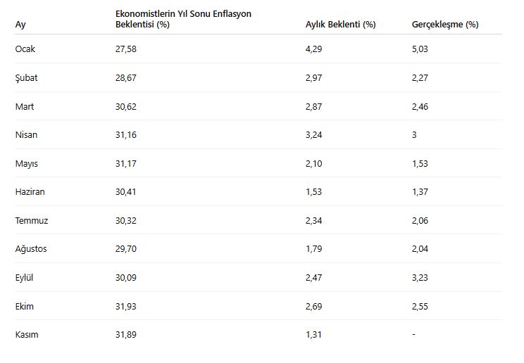 Ekonomistlerin 2025 yıl sonu enflasyon beklentisi, kasım itibarıyla yüzde 31,89 oldu.