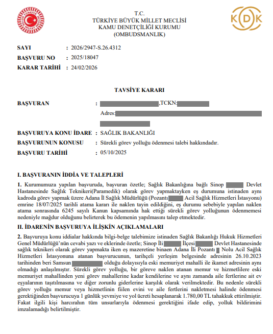 Türkiye Büyük Millet Meclisi’ne bağlı Kamu Denetçiliği Kurumu (KDK), eş durumu nedeniyle tayin edilen bir sağlık çalışanına sürekli görev yolluğu ödenmemesi üzerine dikkat çeken bir karara imza attı. Kurum, yaptığı inceleme sonucunda başvuruyu haklı bularak Sağlık Bakanlığı’na ödeme yapılması yönünde tavsiyede bulundu.