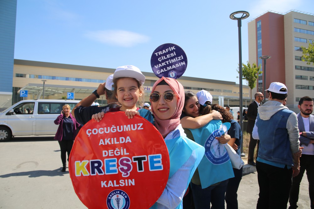 Sağlık emekçilerinin yaşadığı sorunlarının başındaki diğer önemli konunun kreş olduğunu belirten Bolatçı, yeni açılan hastanede kreş hizmetinden mahrum olduklarını belirtti. Bolatçı, devamında şunları kaydetti: “Sağlık, 24 esaslı verilen temel kamu hizmetidir. Gece -gündüz ya da bayram - tatil fark etmez sağlık hizmetleri, bizler üzerinden yürür. Ancak bizim de ailelerimiz var, bizim de çocuklarımız var. Burada yaklaşık 7 bin kişi çalışıyor. Her birimiz birer anne, birer baba. Kadın çalışanların oranı yüzde 70 dolayında. Normal mesaide olan veya nöbete kalan pek çok arkadaşımızın aklı çocuğunda kalmaktadır. Çünkü çocuklarımızı bırakabileceğimiz kreş imkanından yoksunuz. Çocuğumuzu teslim ettiğimizde, gözümüz arkada kalmayacak 24 saat esaslı hizmet veren kreşler istiyoruz. Bu ülkenin bir sağlık çalışanı; bir anne, bir baba olarak bunu istemenin de en doğal hakkımız olduğu inancındayız. Üstelik önceden çalıştığımız hastanelerde kreş imkanı vardı.”