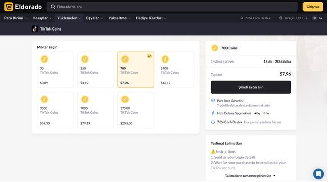 Özellikle TikTok’ta sık vakit geçiren ve çeşitli yayıncıların yayınlarını sürdürebilmeleri için onlara destek olmayan isteyen kullanıcılar, TikTok jeton yükleme yoluyla sahip oldukları jetonları artırıyor. Bu jetonlar, TikTok’un resmi kanallarında satılabildiği gibi, Eldorado gibi global pazaryerlerinden de satın alınabiliyor. Aynı zamanda satışa da çıkarılabiliyor.