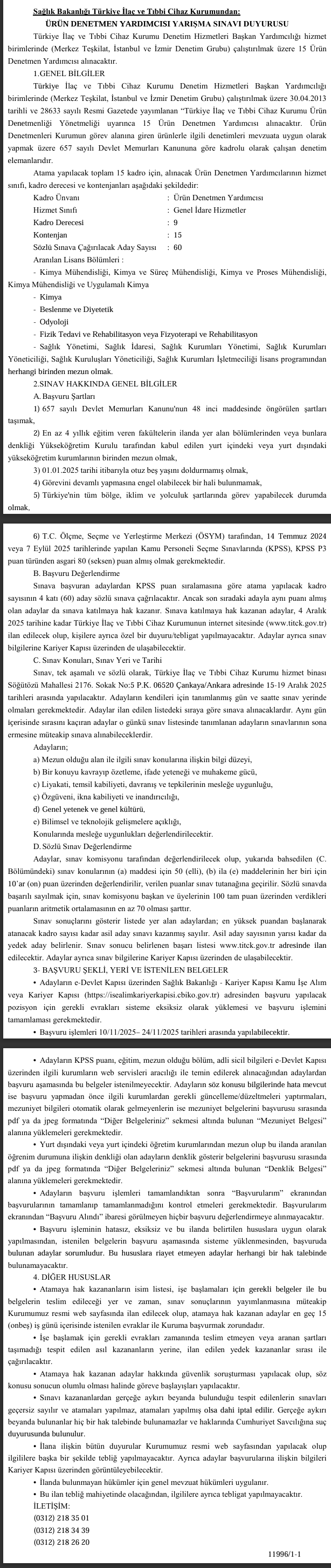 Türkiye İlaç ve Tıbbi Cihaz Kurumu Ürün Denetmen Yarımcısı Yarışma Sınavı