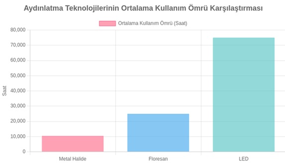 · Kullanım Ömrü: Bir LED armatürün ömrü 50.000 ila 100.000 saat arasında değişirken, metal halide lambaların ömrü genellikle 6.000 ila 15.000 saat ile sınırlıdır. Bu, LED'lerin bakım ve değiştirme maliyetlerini önemli ölçüde azalttığı anlamına gelir.